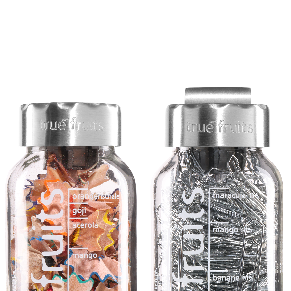 Glasklare Entscheidung: Die Glasflaschen können zu 100 % recycelt werden, doch für viele sind sie einfach zu schön zum Wegwerfen. Um der Flasche ein Leben nach dem letzten Schluck zu ermöglichen, widmet sich true fruits deswegen seit 2014 dem Thema Upcycling. Ob kleiner Smoothie, großer Smoothie oder Shot – jede Flasche findet ihren Aufsatz. Inzwischen bietet das Upcycling-Sortiment einiges an Auswahl. Im Handumdrehen wird aus einer leergetrunkenen Flasche ein Seifenspender, eine Gewürzmühle, ein Zuckerstreuer und vieles mehr. Damit unterstreicht true fruits die Wertigkeit von Glas und macht auf seine vielfältigen Wiederverwendungsmöglichkeiten aufmerksam. Die NoLemonade kommt in 330 ml-Flaschen, mit einer etwas größeren Flaschenöffnung und hat noch keinen passenden Aufsatz – für Upcycling kann die Flasche aber trotzdem verwendet werden.