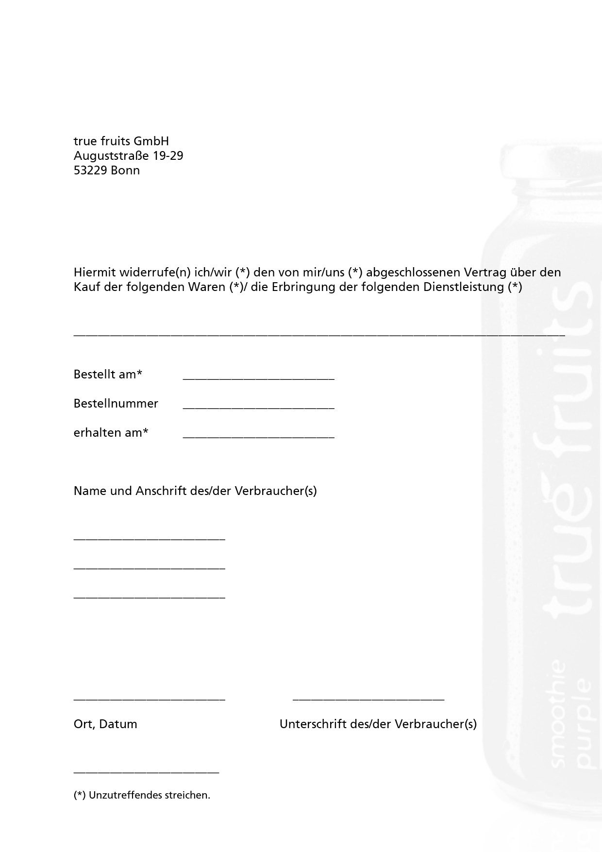 Sie haben die Waren unverzüglich und in jedem Fall spätestens binnen vierzehn Tagen ab dem Tag, an dem Sie uns über den Widerruf dieses Vertrags unterrichten, an uns (true fruits GmbH, Auguststraße 19-29, 53229 Bonn) zurückzusenden oder zu übergeben. Die Frist ist gewahrt, wenn Sie die Waren vor Ablauf der Frist von vierzehn Tagen absenden.