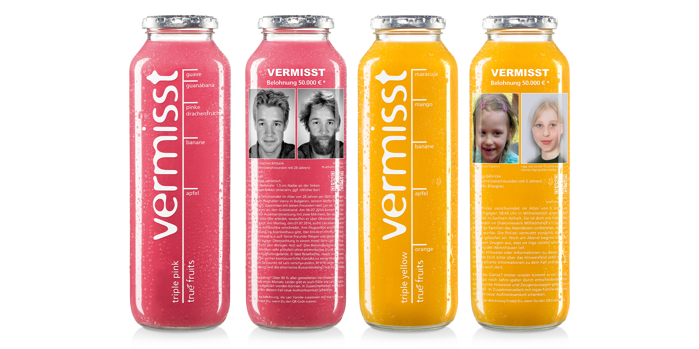 November 2024 wurden die Vermisstenanzeigen von Inga Gehricke und Lars Mittank auf unsere großen Smoothies gedruckt. Die Familien der beiden sind diesen ungewöhnlichen Schritt gegangen, um Menschen zu erreichen, die über die üblichen Suchkanäle nicht erreicht werden. Über mehrere Wochen standen die Vermisst-Flaschen in über 30.000 Märkten und lenkten so den Fokus der Öffentlichkeit auf die Suche nach Inga und Lars - tatsächlich gingen auch neue Hinweise ein.