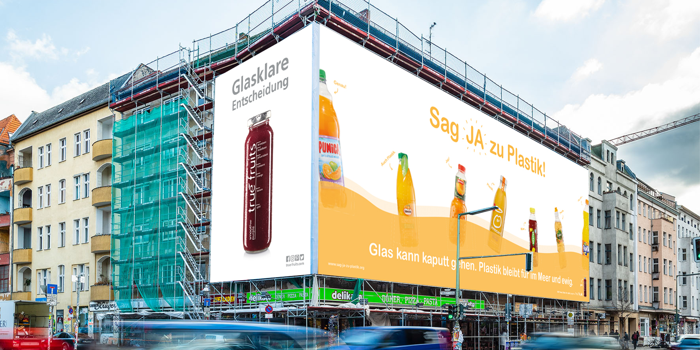 Nous avons lancé en Allemagne et en Autriche une campagne d'affichage originale sur le thème du plastique. La campagne comportait deux messages qui occupaient des lieux très fréquentés dans six villes. Outre de grandes surfaces, nous avons utilisé des affiches XXL, dont certaines couvraient plus de 600 mètres carrés. L'objectif de la campagne était d'attirer l'attention sur les emballages en plastique. Les affiches ont ensuite été transformées en trousses et distribuées aux clients.