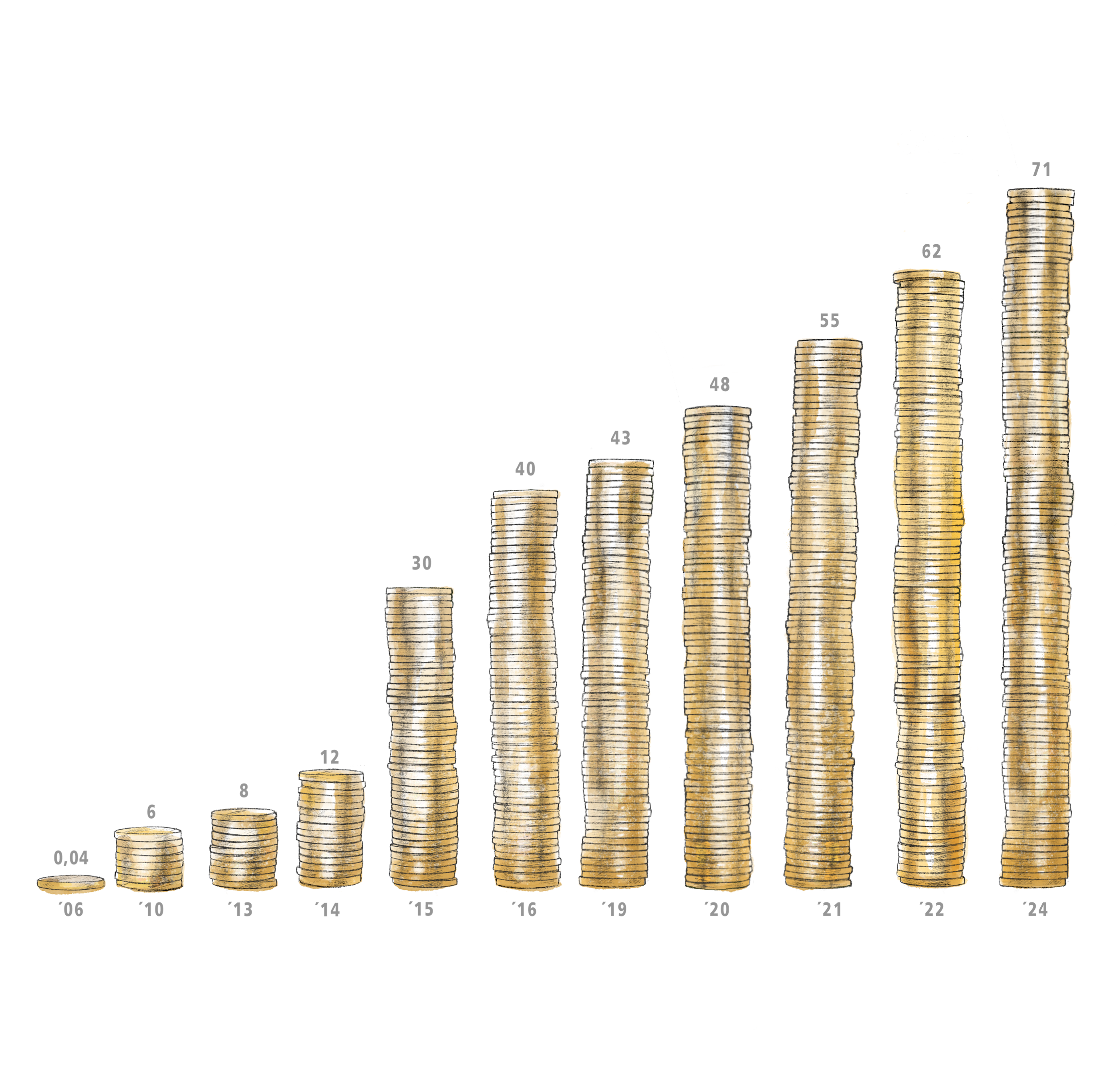 2006 sind Inga, Marco & Nic mit true fruits gestartet und haben im ersten Jahr einen Umsatz von 40.000 Euro generiert – und das ohne Marketingbudget! Sieben Jahre später, mit inzwischen 19 Mitarbeitern, hat true fruits seinen Umsatz auf 7,55 Mio. Euro steigern können. 2015 sind wir dann komplett ausgerastet! Nicht zuletzt durch die Einführung unseres ersten green Smoothies konnten wir unseren Umsatz fast verdreifachen. Von 11,5 Mio. Euro in 2014 auf 29,14 Mio. Euro im Jahr 2015. Ein Jahr später kratzen wir an der 40 Mio. Euro-Grenze. Auch danach ging es immer weiter bergauf! Bis 2024 konnten wir unseren Jahresumsatz von 2016 um knapp 78% steigern – auf 71 Millionen Euro Umsatz. Seit 2015 bis heute sind wir zudem Marktführer im Bereich gekühlte Frucht. #startedfromthebottle (Quelle: A.C. Nielsen)