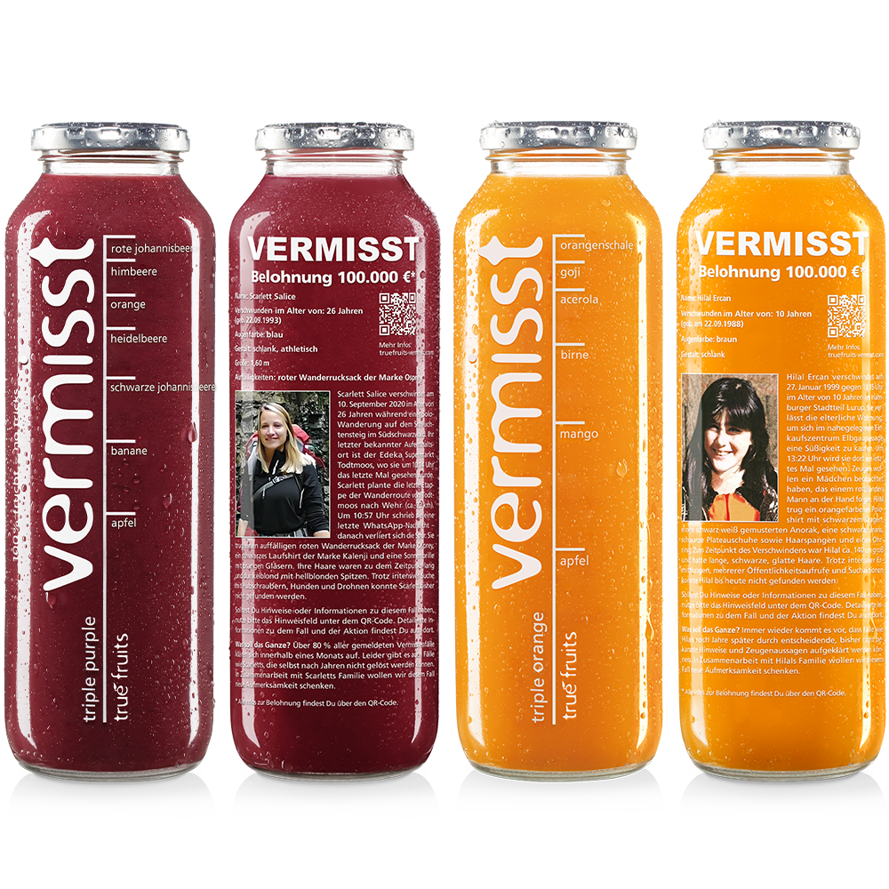 In Deutschland werden circa 80% der als vermisst gemeldeten Personen innerhalb weniger Wochen wiedergefunden. Es gibt aber auch Fälle wie die von Inga Gehricke und Lars Mittank, die über Jahre nicht geklärt werden können. In enger Zusammenarbeit mit den Familien von Lars und Inga haben wir Infos zu diesen beiden Fällen für einen bestimmten Zeitraum auf all unsere 750 ml Flaschen gedruckt. Die Familien erhoffen sich durch die Reichweite unserer Flaschen, Aufmerksamkeit für die Vermisstenfälle zu schaffen und neue, entscheidende Hinweise zur Klärung dieser Fälle zu erhalten. Weitere Infos und Hinweise zur Belohnung findest Du über den auf den Flaschen hinterlegten QR Code oder hier.