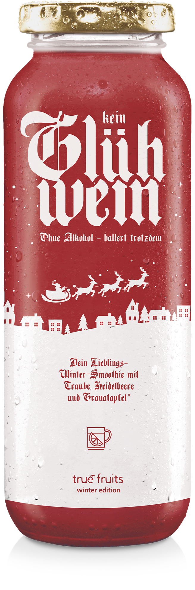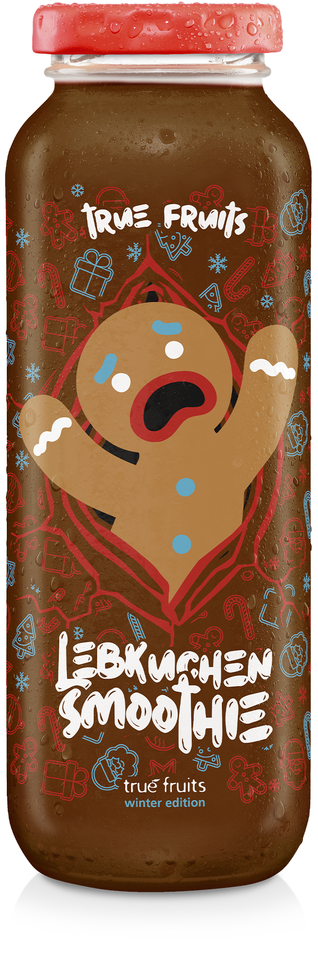 Unser Geheimrezept beinhaltet unter anderem Traubensaft, Haselnussmus, Zimt, Kokosmilch und Bananenpüree (okay ganz so geheim ist es dann doch nicht, wenn Du den Blick mal nach unten schweifen lässt). Mit 105 kcal auf 100 ml ist das Ganze nicht ganz so heavy wie Omas Zuckerbombe aber als gesund werden wir Dir diesen Smoothie bestimmt nicht verkaufen. Das Einzige, was Dir unsere winter edition im Vergleich zum klassischen Zimtstern nicht bieten kann, ist die Sternform. Deshalb haben wir vorne –kreativ wie wir sind– einfach einen Stern draufgedruckt. Der wird Deiner Oma ganz bestimmt nichts sagen, aber die bleibt sowieso ihren selbstgebackenen Zimtsternen treu.